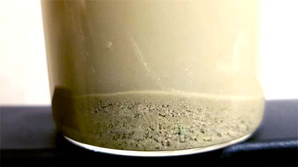 Im Wasser zerfallen die Klumpen aus Bentonit. Es entsteht eine Masse aus schwerem Schlamm.