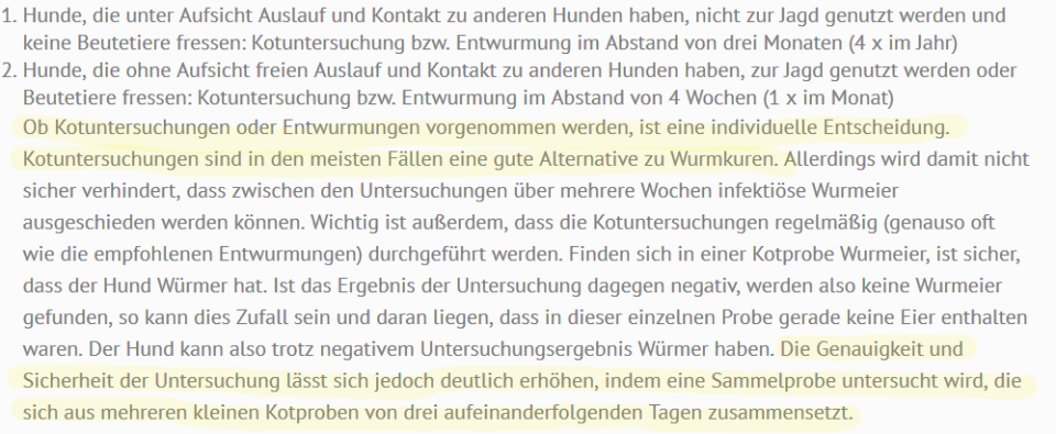 Auszug ESCCAP-Website: Der gelb markierte Text ist bei den Beiträgen für Hunde und Katzen identisch und gilt für beide Tierarten. Quellen: ESCCAP: Wie kann ich meinen Hund vor Würmern schützen? und ESCCAP: Wie kann ich meine Katze vor Würmern schützen?
